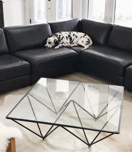 The pyramid coffee table gets its name from the four steel sheet legs that slant outwards, creating the silhouette of a pyramid. The finish and hardware are exceptional for the price, as we saw the exact piece at another retailer for $300. The listing is for the base only, top is not included in the price. 4 pyramids hold up the suede table. Casual and great for storage.